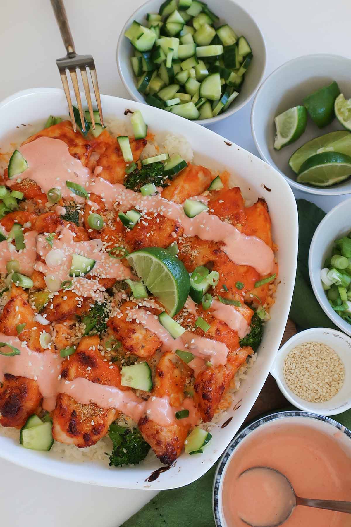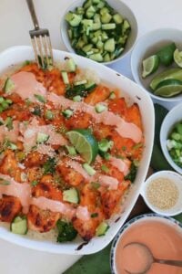 Remove from the oven and drizzle with the reserved sauce. Finish with sesame seeds, green onions, cubed cucumber, and a squeeze of fresh lime just before serving.