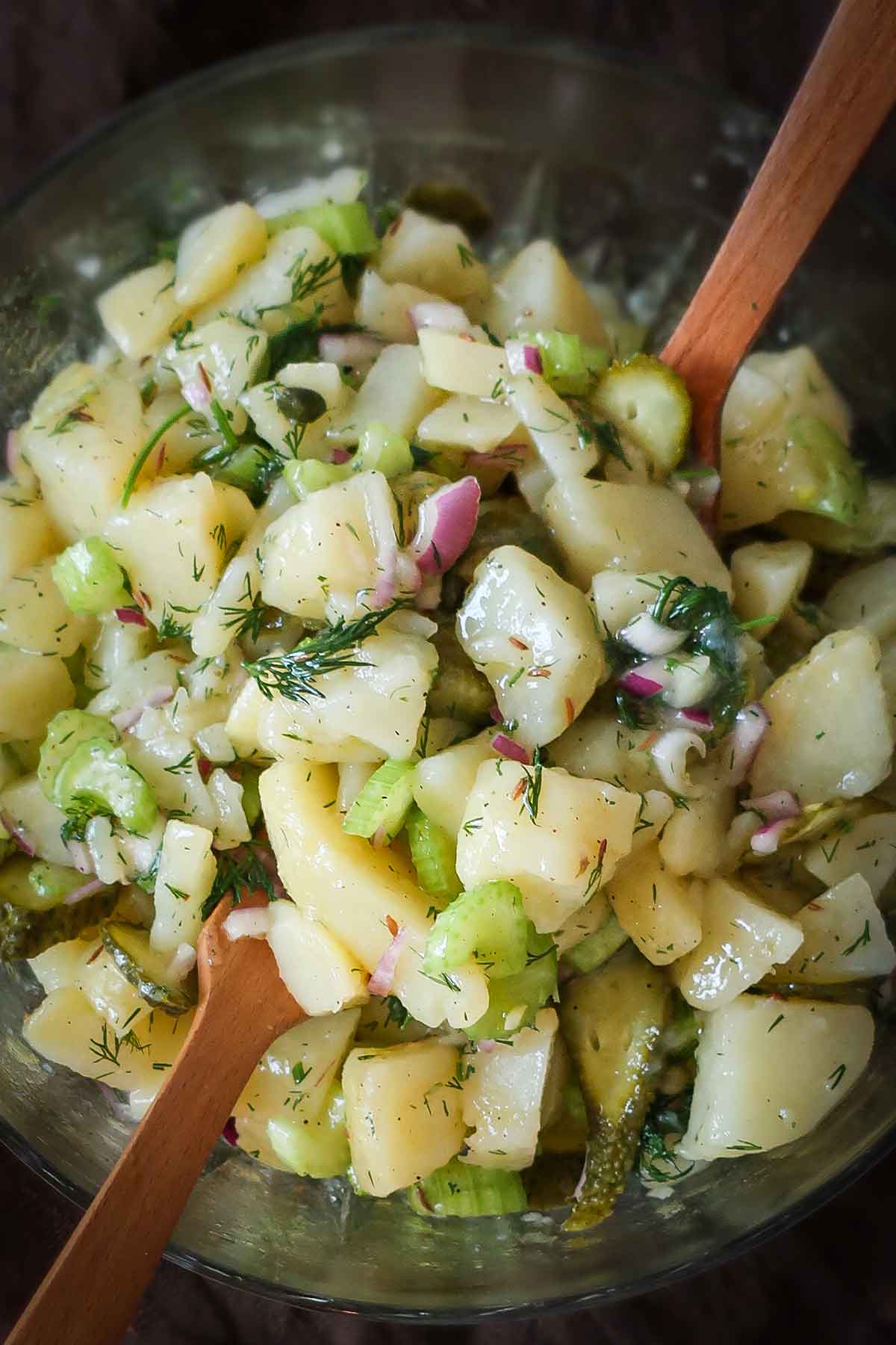 Place the diced potatoes in a large salad bowl and add remaining ingredients; 1/2 medium-sized red onion, diced 3 ribs of celery (about 1 cup diced), 4 baby dill pickles, sliced, 3–4 tbsp capers, 1 tsp caraway seeds (optional), 1/2 cup water, 1/4 cup apple cider vinegar or white vinegar, 1/4 cup extra virgin olive oil, Sea salt and GF ground black pepper, to taste