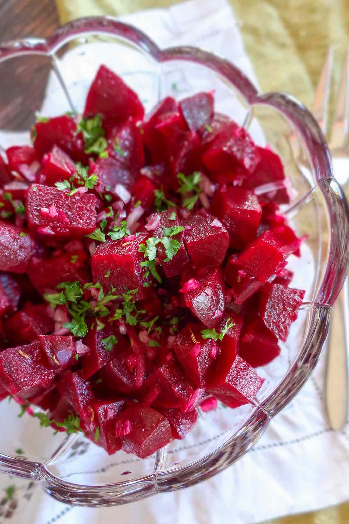 This vibrant plant-based Eastern EuropeanBeet Salad is a nutritious side dish with healthy fats and fiber. This root salad is made with sweet, fresh beets, a light vinaigrette, onions, caraway seeds, and fresh parsley. A salad that has the perfect balance of fresh and delicious flavors. It can be enjoyed cold or at room temperature, making it a wholesome addition to your meal.